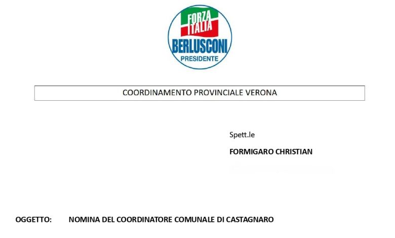 Questo, invece, il commento di Roberto Donà, vicecoordinatore provinciale e responsabile per la Pianura Veronese: «Come vicecoordinatore provinciale di Forza Italia responsabile di zona per la Pianura Veronese, sono lieto di comunicare la nomina, da parte del segretario provinciale Claudio Melotti, di Christian Formigaro a coordinatore comunale di Castagnaro. Christian è una persona di esperienza politica, profondo conoscitore del territorio, con cui sapremo dialogare e lavorare nell’interesse dell’intera Pianura Veronese, dei territori e dei cittadini, non solo di Castagnaro ma anche dei Comuni limitrofi. Con la sua nomina si consolida un gruppo già attivo e radicato, composto da persone che da tempo collaborano con serietà e passione. Sono certo che sapranno interpretare al meglio i valori e le tematiche di Forza Italia sul territorio, rafforzando la presenza del partito a Castagnaro e coinvolgendo sempre più giovani e donne in un progetto politico inclusivo e concreto».